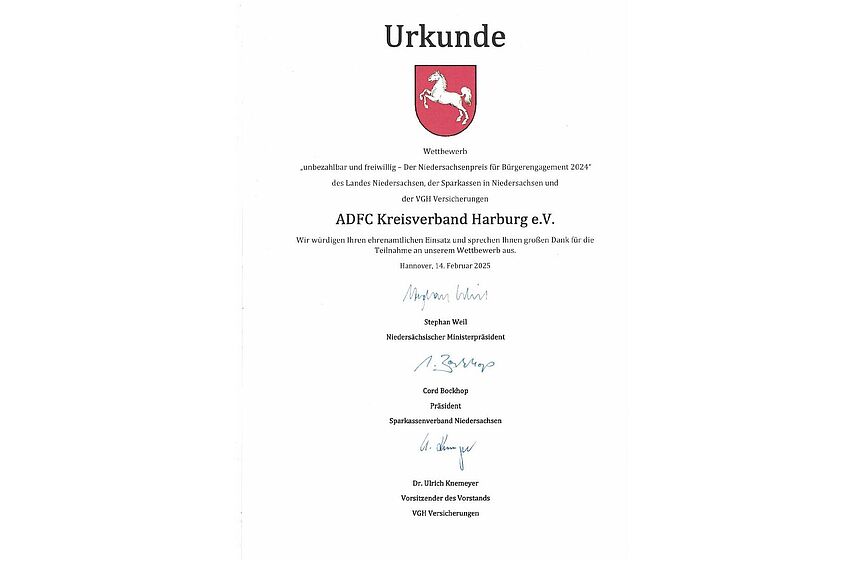 Für den ehrenamtlichen Einsatz hat der ADFC Kreisverband Harburg e.V. eine Ehrenurkunde in dem Wettbewerb „unbezahlbar und freiwillig – Der Niedersachsenpreis für Bürgerengagement 2024“ erhalten.